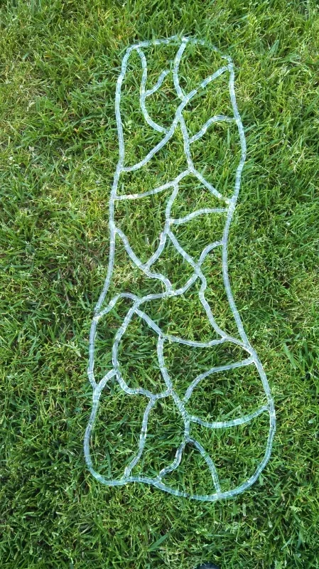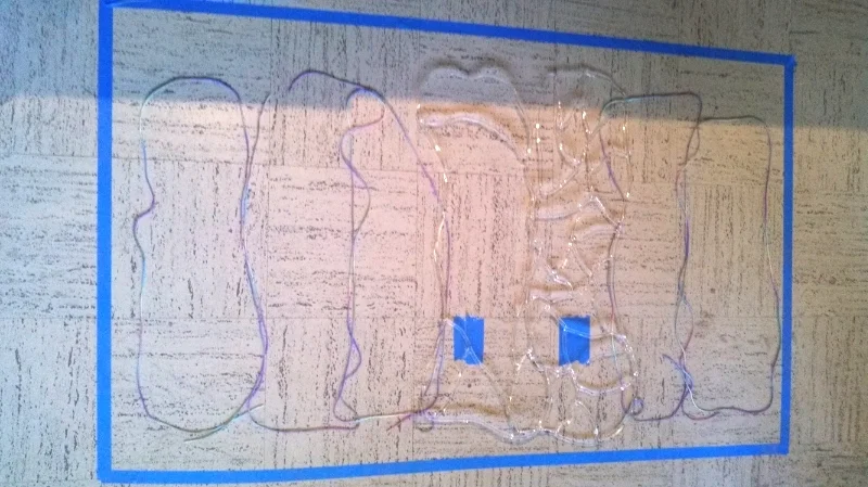 First a "sketch" on the floor with tape and yarn. Here's one panel complete and the outline of the second. The blue squares are nasty outlets I'll have to deal with. Hopefully the botanical clusters I place in front of them will sufficiently hide them.