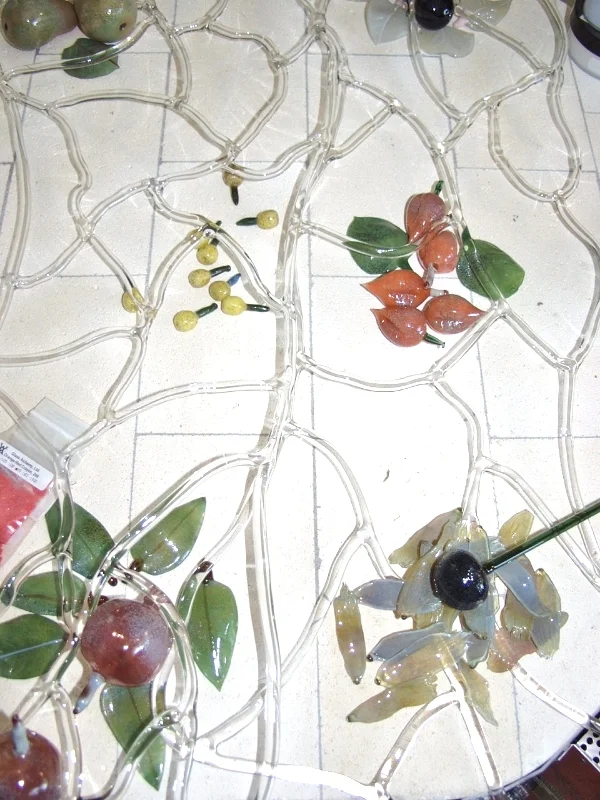 On to the botanical elements. I used random spare or "dud" parts from my studio, laid them out on top of my large kiln, "sketching" the elements and how they would fit together. The little jars are filled with glass powders in a variety of colors. Over the next weeks I replaced the mock parts with actual parts that will be on the panels - the kunquots (upper left), pears (center top), small yellow buds (center), lantenr pods (middle right) and flower petals (lower right) are done. I usually start with the fruits so I can see their shapes and colors, then decide on shapes and colors for the leaves. Leaves are difficult and time consuming so I have a habit of procrastinating on those. I should probably change my practice and always make the leaves first!