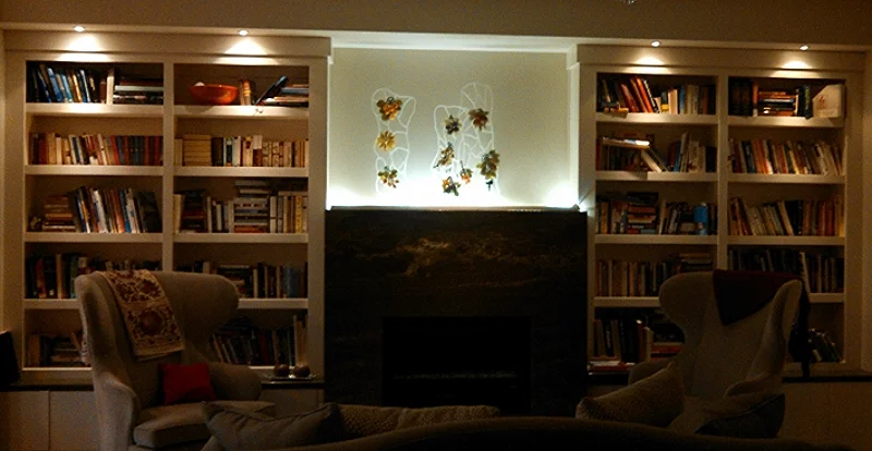 We just temporarily laid the light strip along the back and I hung the panels and botanical clusters.