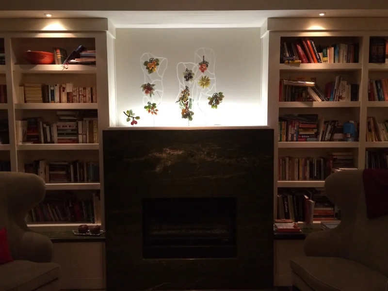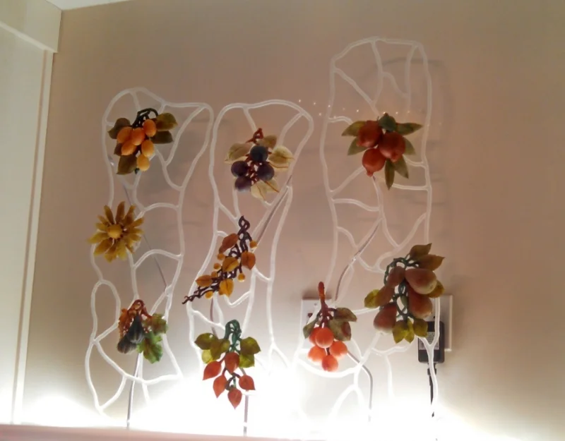 Over the two days, I had scurried to make a new botanical element to cover the big TV outlet. I treated the surface of the glass with glass with ArmorAll to moisten the sandblasted glass and bring out the colors.