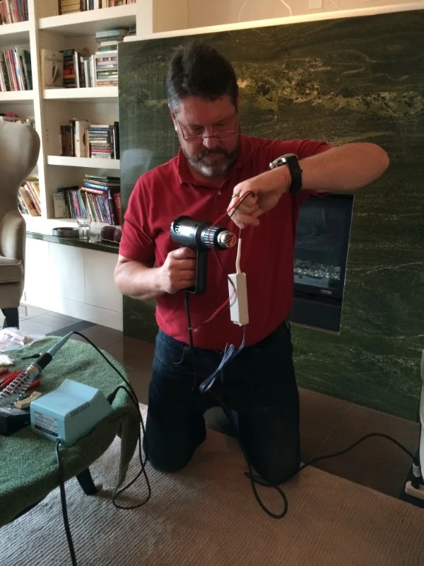 Brent, knowing electrical stuff, came up with a solution of splicing a white power source and a new cord and plug onto the connector.