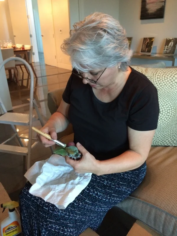 To avoid damaging Cynthia's wood, I decided to make a wood base for the piece. My husband Brent helped with cutting, routing and drilling. I sanded and painted it, then didn't like the surface so I sanded all that paint off and started over with deeper sanding. (For your car buffs, just behind me is a '57 Chevy Nomad that Brent is rebuilding.)