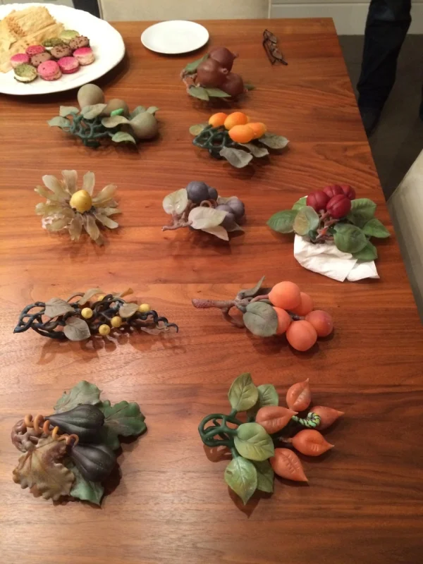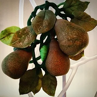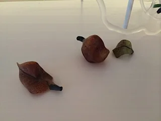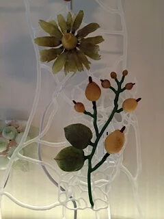 Two installations ago I took out the pears while rearranging elements, and I brought them back this time. This piece has a monarch cocoon.