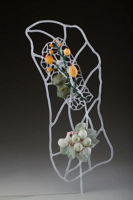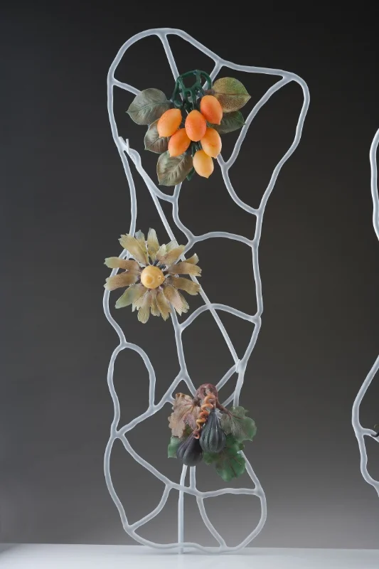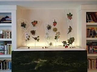 Growth always includes death, so I sprinkled some fallen leaves and shriveled fruits under the trellises. The alcove is high enough that they don't show when standing back to look at the piece, especially for shorter people. Visible is just a hint that something is there, which I hope will draw people closer to look.
