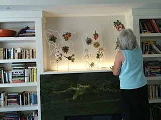 During installation I re-arranged the botanical elements, moving some around to balance the design. I placed two light colored elements in front of the plum cluster covering the TV outlet in back. Although it leaves that cluster relatively unobscured, I'm still not happy with it. Again next time, I'll come back with a better solution.